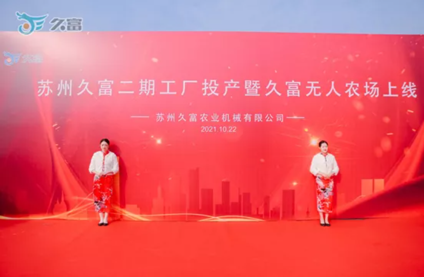 2021年10月22日,苏州久富农业机械有限公司二期投产暨久富无人农场上线仪式在苏州市吴江区隆重召开。中国农业机械流通协会会长毛洪,原农业部科教司司长、农业部农业机械化管理司巡视员马世青,农业农村部南京农业机械化研究所所长陈巧敏、农业农村部农业机械化总站信息处副处长朱礼好、江苏省农业机械技术推广站站长陈新华、江苏大学二级教授李耀明、吴江经济技术开发区管委会副主任朱云根,以及来自江苏省、市、区相关单位的领导嘉宾和久富全国经销商代表、合作单位代表、行业媒体代表等共计200多名嘉宾参加了投产庆典仪式。