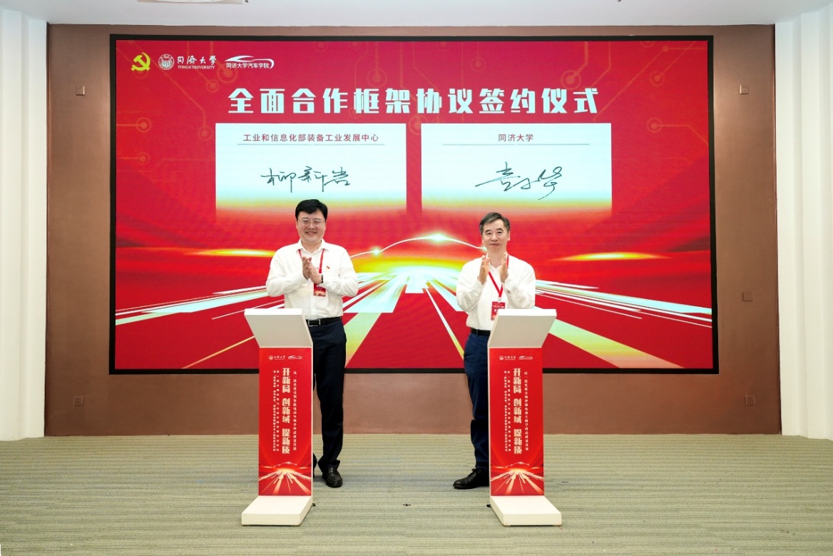 为深入落实全国新型工业化推进大会部署要求,进一步推进政产学研用深度合作,2025年10月12日,在同济大学举办的首届全国高校汽车类学院党委书记论坛开幕式上,工业和信息化部装备工业发展中心党委书记柳新岩与同济大学副校长童小华院士代表双方单位签署全面合作框架协议。