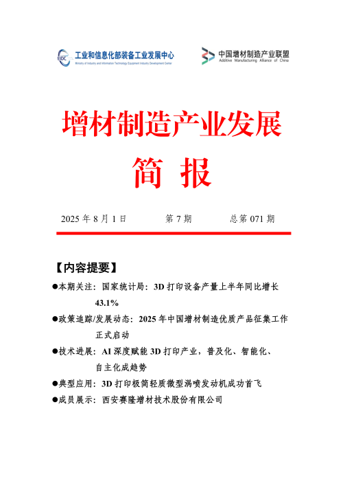以下是《增材制造产业发展简报》2025年第07期(总第071期)