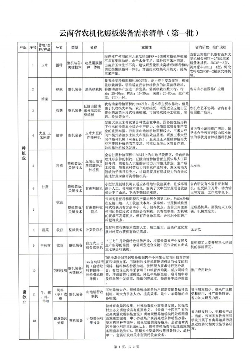 云南省农业农村厅 云南省工业和信息化厅关于公布云南省农机化短板装备需求清单(第一批)的通告